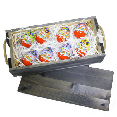 В составе деревянный ящик нашего производства (цвет фиолетовый), 8 киндер-сюрпризов, декор